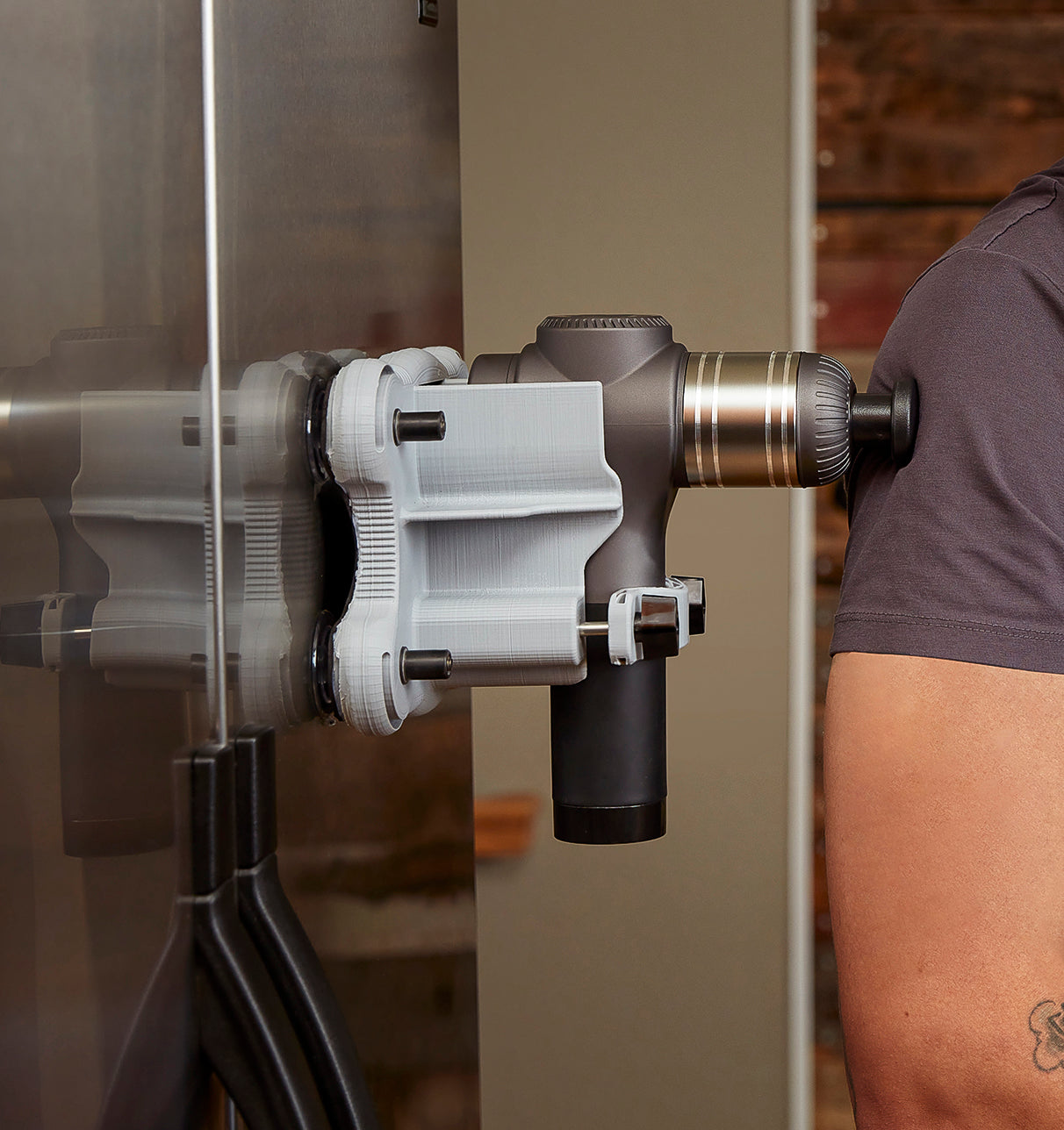 The Cradle works with most massage guns and includes: 1) Four suction cups for mounting on non-porous surfaces like flat metal and ceramic tile [do not use on glass]; 2) A strap kit for mounting on weight racks and poles (up to an 8" diameter). Does not include massage gun.